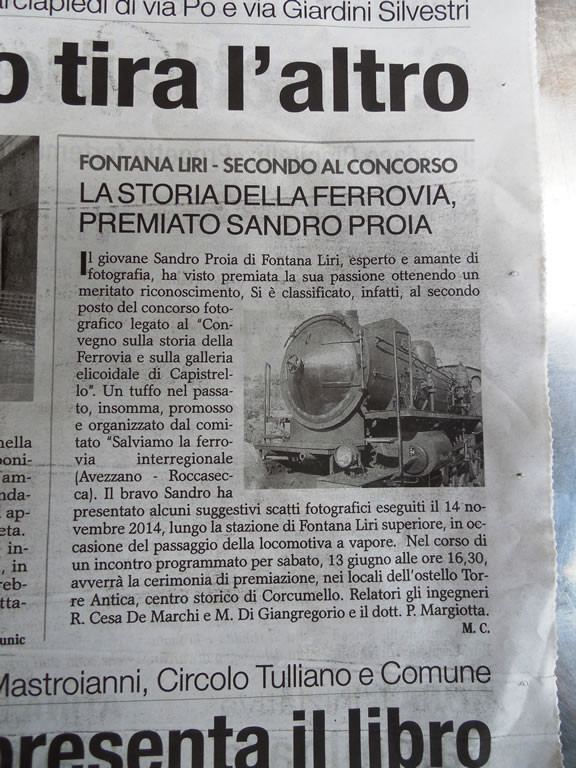articolo_concorso_fotografico_storia_ferroviaRiportiamo l’articolo del quotidiano La provincia in merito al Concorso fotografico indetto dal Comitato Salviamo la Ferrovia Roccasecca-Avezzano che ha visto al secondo posto il fontanese Sandro Proia.