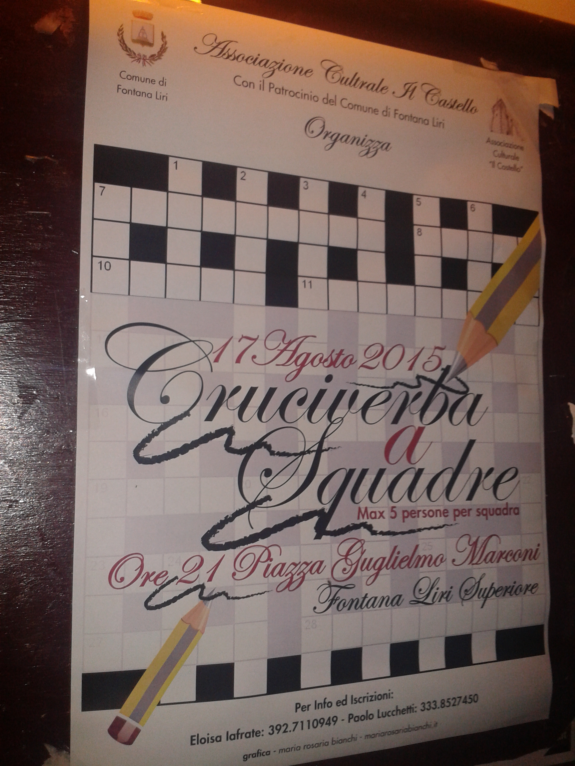 Ritorna a grande richiesta “Il Cruciverbone”. Un appuntamento che negli anni passati era divenuto una tradizione: per tutti gli appassionati, ma anche per i tanti curiosi, “Il cruciverbone a squadre”, serata di intrattenimento promossa dall’Associazione Culturale “Il Castello” a Fontana Liri superiore. Non mancate.