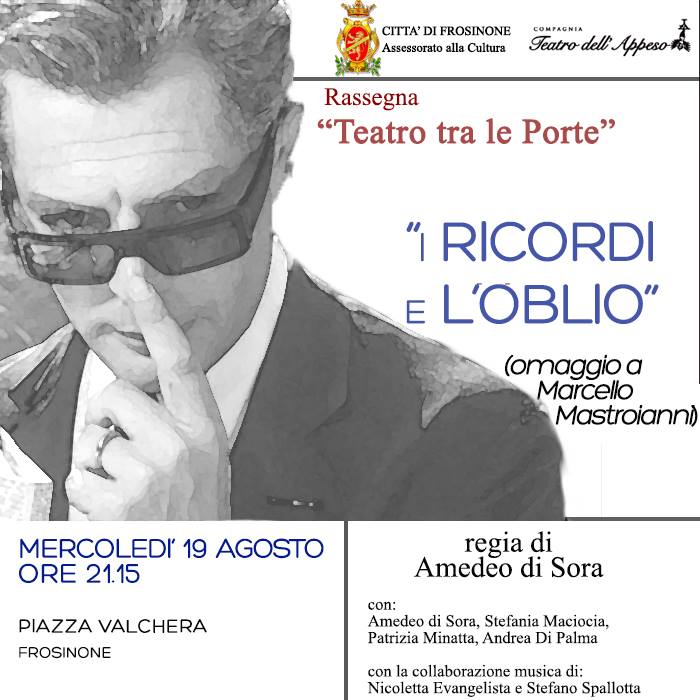 omaggiomastroianniQuesta sera, mercoledì 19 spettacolo teatrale a Frosinone su Marcello Mastroianni. La “Compagnia Teatro dell’Appeso”, diretta da Amedeo di Sora, presenterà mercoledì 19 agosto 2015 in Piazza Valchera a Frosinone, alle ore 21:15, lo spettacolo “I ricordi e l’oblio (omaggio a Marcello Mastroianni)”, che concluderà la terza edizione della Rassegna Teatrale Estiva “Teatro tra le Porte”, promossa dal Comune di Frosinone-Assessorato alla Cultura.