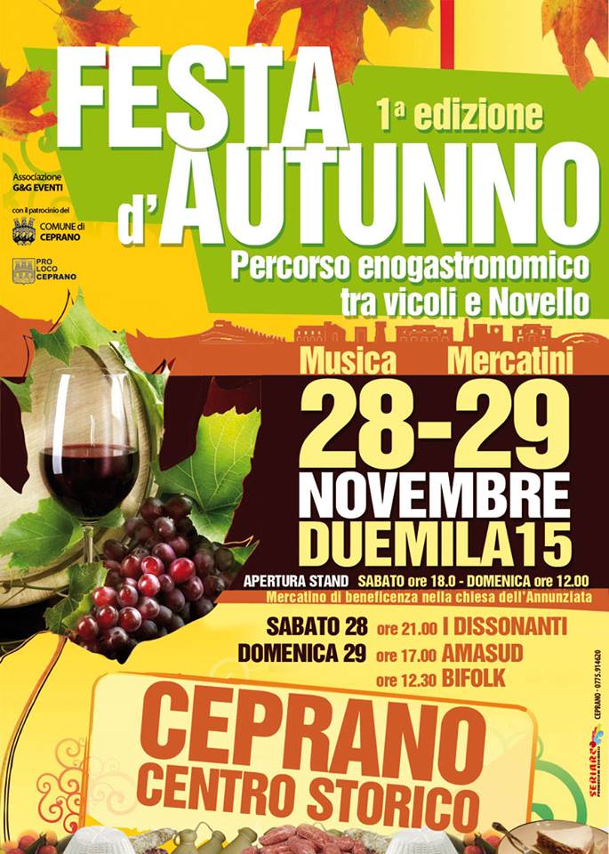 Sabato 28 e Domenica 29 Novembre “Festa d’Autunno” a Ceprano. Sabato 28 Novembre alle ore 18,00 comincia a Ceprano la due giorni dedicata all’enogastronomia. Percorso enogastronomico tra i vicoli e la piazza, condito con vino novello. Musica, divertimento e mercatini, tra cui anche uno di beneficenza presso la Chiesa dell’Annunziata. Sabato sera anche la musica dei Dissonanti, mentre domenica alle 12,30 i Bifolk ed alle 17,00 gli Amasud. La manifestazione, fortemente voluta dall’amministrazione comunale di Ceprano, è promossa dall’Associazione G&G Eventi e dalla Pro Loco di Ceprano e vede, tra i collaboratori, anche l’Associazione Culturale “Il Castello” di Fontana Liri (con più di qualche stand allestito da fontanesi).