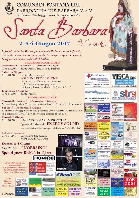 Prende il via Venerdì 2 Giugno, la festa di Santa Barbara. Il programma religioso prevede la Santa Messa Sabato 3 Giugno alle ore 18,30 ed a seguire la solenne processione per le vie del paese, indicaticamente per le 19,00. Il programma civile si articola in tre serate estremamente ricche e variegate. Venerdì 2 Giugno la sagra degli gnocchi con lo spettacolo musicale degli Energy Sound e la breve esibizione del gruppo folkloristico La Ciocia. Sabato 3 Giugno toccherà all’orchestra Musica Italiana allietare la serata, infine Domenica 4 Giugno gran finale con i Nobraino più Briga, special guest in Dj set.