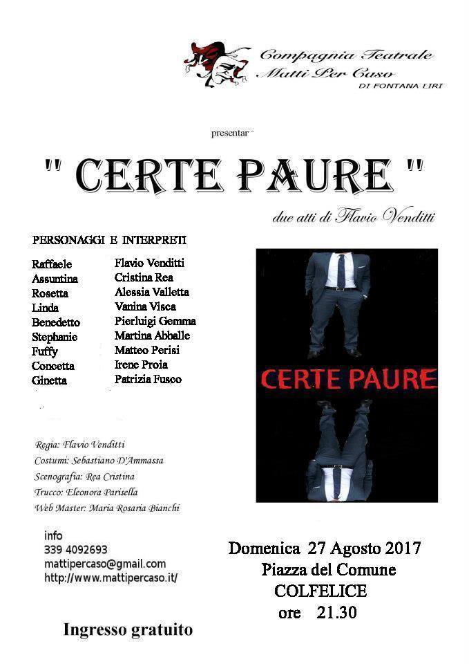 Questa sera la compagnia Matti per Caso a Colfelice. I Matti per Caso questa sera, Domenica 27 Agosto, si esibiranno in Piazza del Comune a Colfelice, riproponendo la commedia di Flavio Venditti (questa volta anche nelle vesti di attore) “Certe Paure”, una divertente ed ironica storia di una famiglia in cui il protagonista ha una mentalità chiusa.