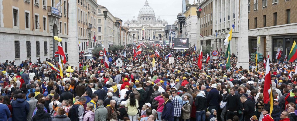 Due nuovi santi per la Chiesa, Papa Giovanni Paolo II e Giovanni XXIII. Papa Francesco, davanti a un’immensa folla – 800 mila persone, stando alle stime della Sala stampa vaticana -, che dalle 5:30 del mattino ha invaso via della Conciliazione e piazza San Pietro, ha letto la formula di canonizzazione per Angelo Giuseppe Roncalli e Karol Wojtyla: “Ad onore della Santissima Trinità, per l’esaltazione della fede cattolica e l’incremento della vita cristiana, con l’autorità di nostro Signore Gesù Cristo, dei Santi Apostoli Pietro e Paolo e Nostra, dopo aver lungamente riflettuto, invocato più volte l’aiuto divino e ascoltato il parere di molti Nostri Fratelli nell’Episcopato, dichiariamo e definiamo Santi i Beati Giovanni XXIII e Giovanni Paolo II e li iscriviamo nell’Albo dei Santi e stabiliamo che in tutta la Chiesa essi siano devotamente onorati tra i Santi. Nel nome del Padre, del Figlio e dello Spirito Santo”. Una grande ovazione della piazza ha sottolineato la solennità del momento.