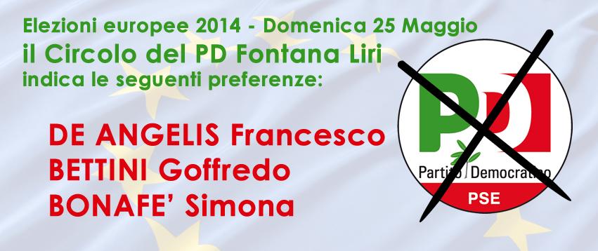 Il Circolo PD Fontana Liri per le elezioni europee di Domenica 25 Maggio dà la seguente indicazione di voto: FRANCESCO DE ANGELIS, GOFFREDO BETTINI, SIMONA BONAFE’.